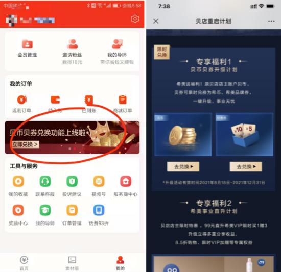 上述商家发现,除了邀请用户成为希美会员外,贝店还开放了贝币、贝券(贝店平台用户的优惠补贴)到希币、希美品牌券(希美平台用户的优惠补贴)。“贝币、贝券商家是出了钱的,贝贝把我们花钱发的券用在了自己的产品上!”
