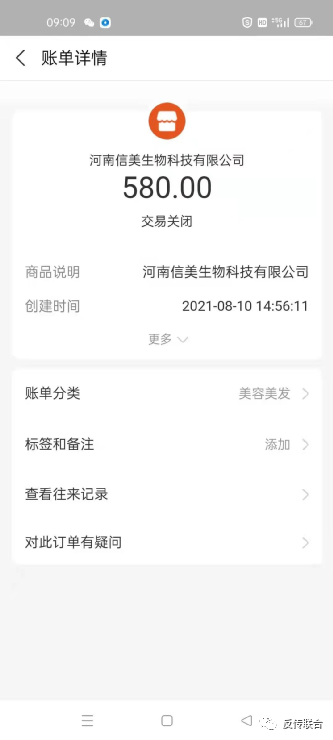 因投资了14580元,该网友从VIP直接升级到省级代理。最后反传销联合会在百度查询河南信美生物科技有限公司或爱茉尔关键词。发现该品牌之前有不少自媒体曝光过,其模式涉嫌传销,退货难屡遭投诉。