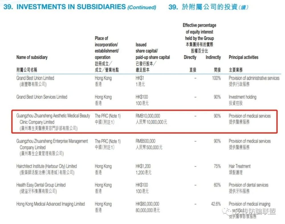 医思健康2020/21年度报告显示,医思健康间接持有广州专生美医疗美容门诊部有限公司90%股权,其已缴足股本1000万元人民币。