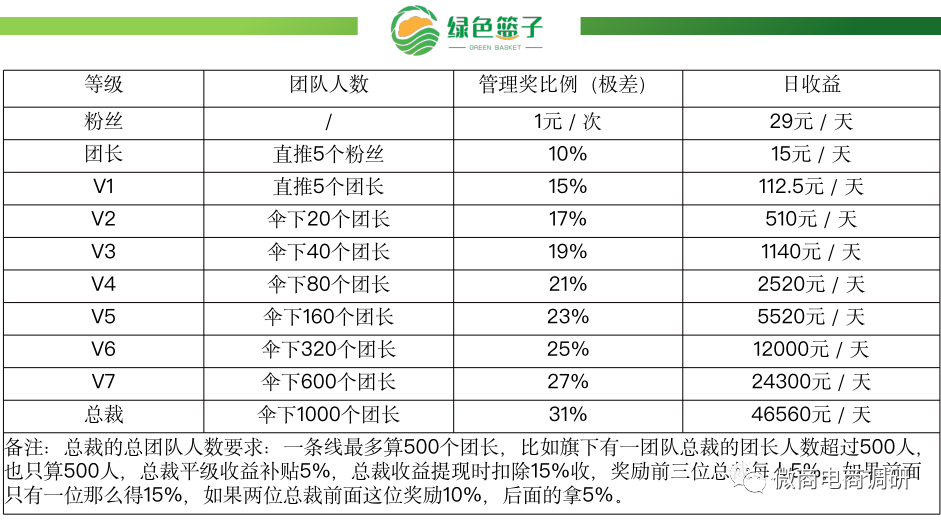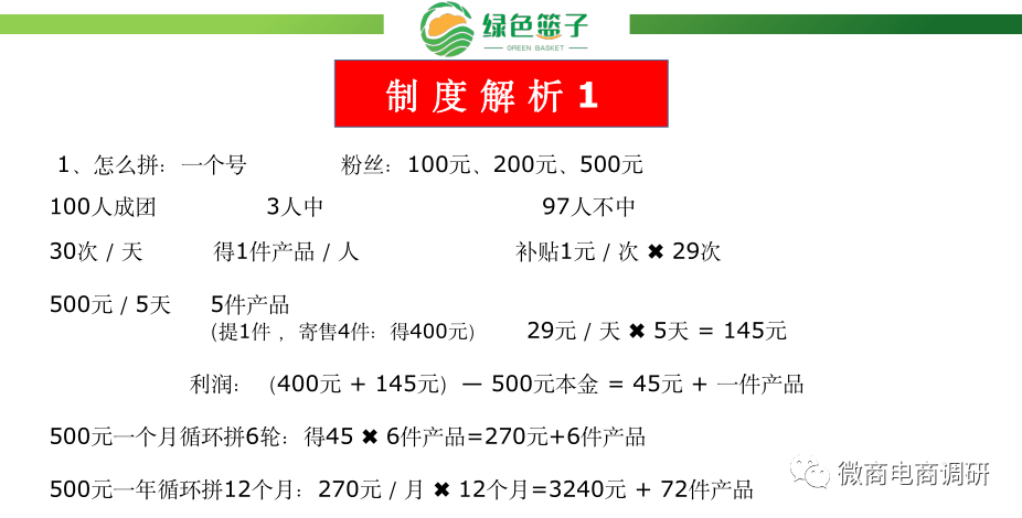 公众号“区块链都知道”也认为:“绿色篮子是最近热度比较高的拼团模式,这个模式说过很多次了,就是包装成电商的资金盘,把这种模式当成是45天回本的资金盘去做,就没有疑虑了,不同项目回本周期不同,但是心里记住资金盘是随时跑路的就行了。”