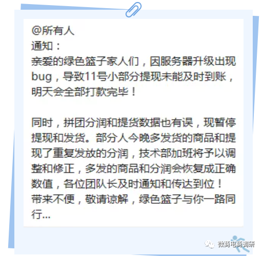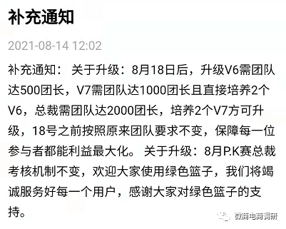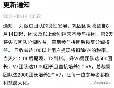 当时间来到8月14日,平台又接连发布了新的《通知》,对制度进行了一定程度上的调整,明确指出:“团长及以上级别隔天不参与拼团,第二天将失去团队分润收益,直接参与拼团后恢复分润权益”。