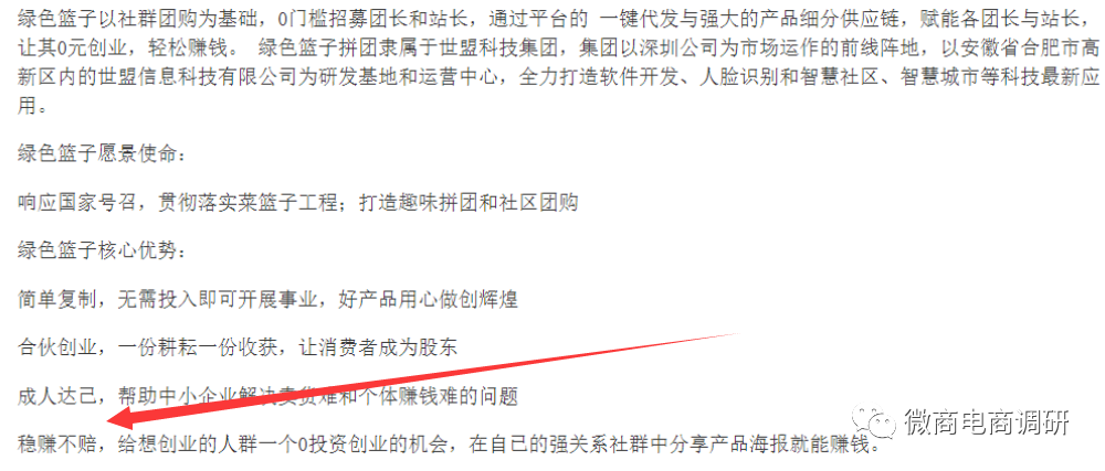 对于绿色篮子的本质,本平台也请来了行业专家对其进行分析,该专家认为:其本质还是打着拼团名义的项目,具有拉人头、多层次等特征。