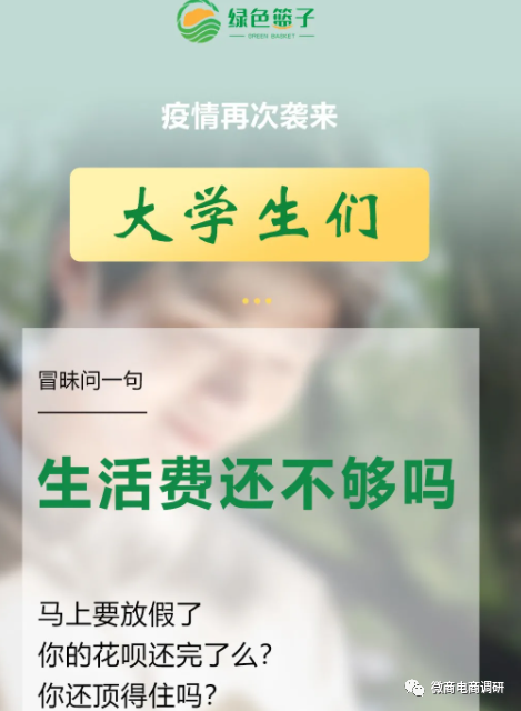 现如今,借着当下疫情蔓延的背景,绿色篮子已把目标人群锁定在了那些“生活费还不够”的大学生的身上。