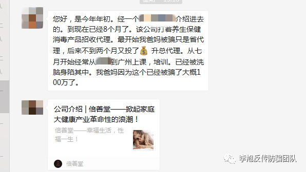 近日,有网友跟李旭反传销团队联系,称其父母因朋友介绍加入了一个叫倍善堂的公司,该公司打着养生保健消毒产品的名义招收代理。最开始的时候,该网友的父母只是加盟成为省代理,不到两个月的时间,因为不断的上课、培训,又投钱升级为总经理,前后总共投资了100多万。