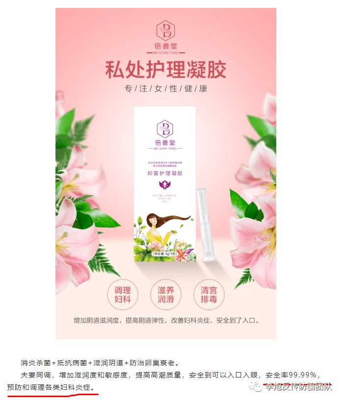 公众号“倍善堂”在宣传中提到,爱尔珍露凝胶是既能避孕又能调理妇科炎症的水溶性凝胶。其避孕率高达99.99%。不仅如此,在市场推广人员的口中,这款凝胶更是有着“神奇”的功效。