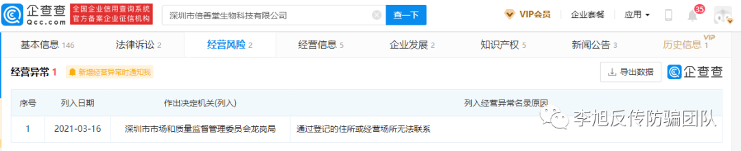 此外,李旭反传销团队了解到,倍善堂公司于2021年3月16日,因通过登记的住所或经营场所无法联系而被深圳市市场和质量监督管理委员会龙岗局列入经营异常名录。