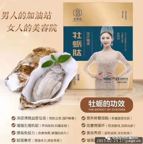 对于倍善堂锦阁牡蛎蛋白肽压片糖果,公众号“倍善堂”是这样宣传的:该款糖果是深圳倍善堂生物科技有限公司研制的最新一代高品质生物科技食品,本品以天然的海洋生物‘牡蛎’为原料,采用本公司特有的小分子肽活性酶化技术,高纯度、高浓度地提取牡蛎中对人体健康有益的精华成分(小分子肽、牛磺酸、锌、硒等),把牡蛎营养功能提高了数百倍,是有效汲取或补充微量元素、维护人体健康的绝佳食品之一”