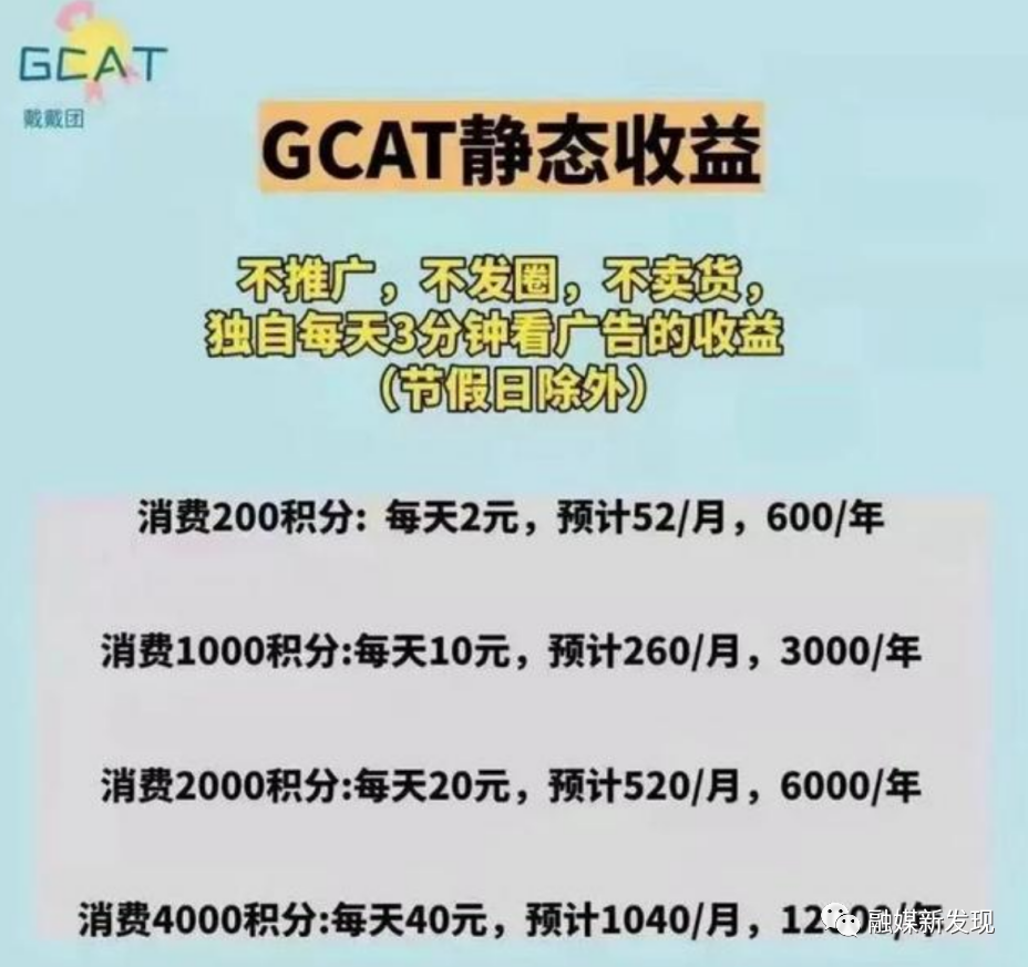 但据相关媒体报道,GCAT的广告电商平台宣传购物可以获得相应积分,积分达到200以后为级别,每天看广告可以获得投资款1%的返利。