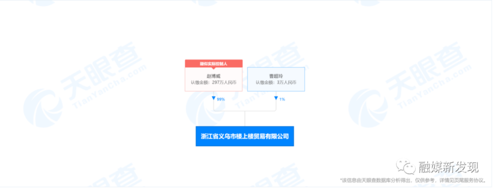 值得注意的是,赵博威还担任浙江省义乌市楼上楼贸易有限公司的监事,持股99%,该公司成立于2019年10月17日,曹超玲担任法人,持股1%。