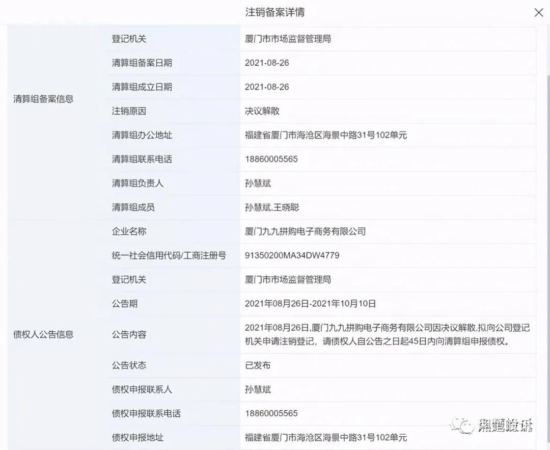 此外,据天眼查APP还显示,2021年08月26日,厦门九九拼购电子商务有限公司因决议解散,拟向公司登记机关申请注销登记,请债权人自公告之日起45日内向清算组申报债权。