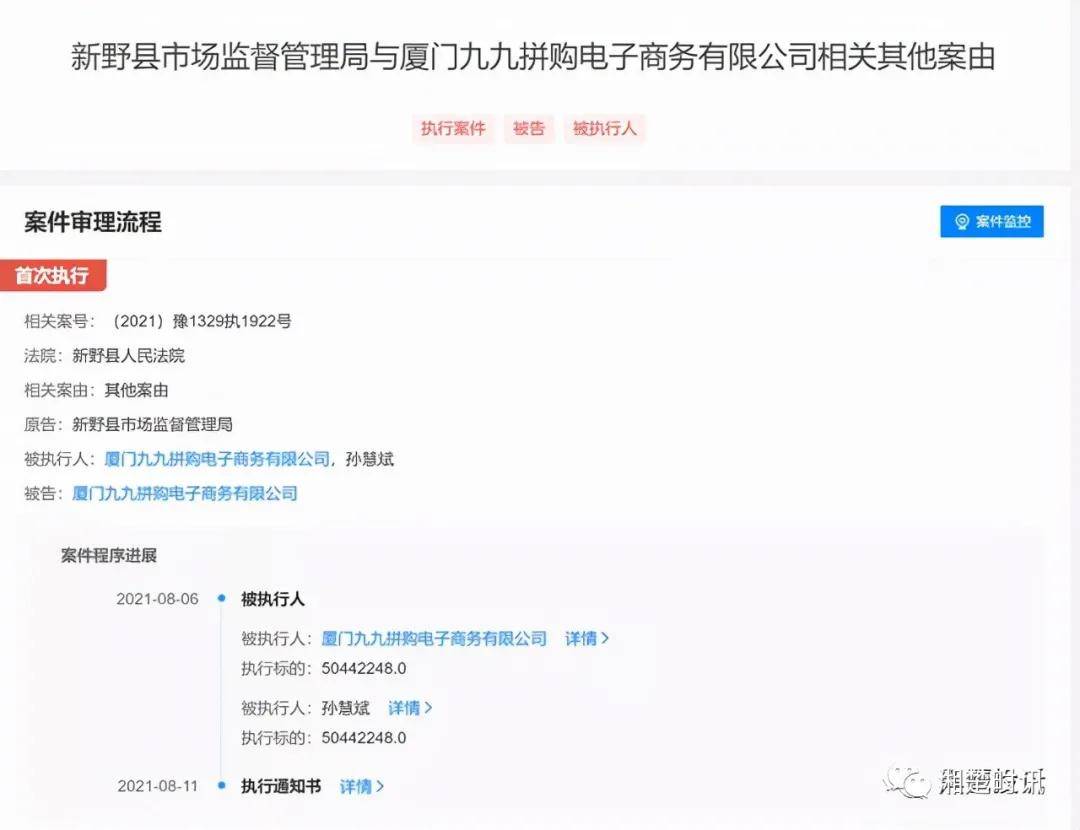 8月30日,中国裁判文书网公布一则题为《新野县市场监督管理局、厦门九九拼购电子商务有限公司等其他案由首次执行执行通知书》(简称:《执行通知书》)。