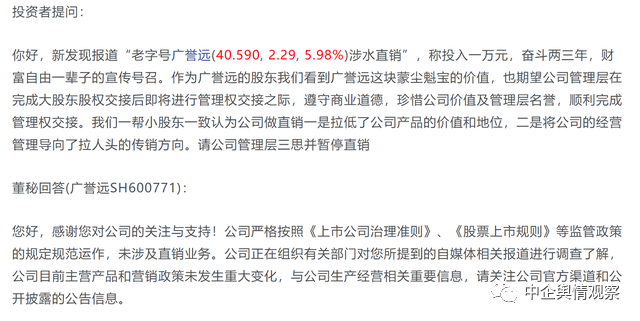 此外,还有投资者提问,你好,新发现报道“老字号广誉远(40.590, 2.29, 5.98%)涉水直销”,称投入一万元,奋斗两三年,财富自由一辈子的宣传号召。作为广誉远的股东我们看到广誉远这块蒙尘魁宝的价值,也期望公司管理层在完成大股东股权交接后即将进行管理权交接之际,遵守商业道德,珍惜公司价值及管理层名誉,顺利完成管理权交接。我们一帮小股东一致认为公司做直销一是拉低了公司产品的价值和地位,二是将公司的经营管理导向了拉人头的传销方向。请公司管理层三思并暂停直销。