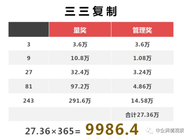 而如何实现年入9986万呢?据李先生介绍的“三三复制”表示,比如自己先发展三个下线,这三个人每人再发展三个下线,以此类推,发展到第五层,就有243个人,这样每天对碰奖(也叫量碰奖)、和管理奖共计可以拿到27.36万,一年下来可以拿到9986.4万元。