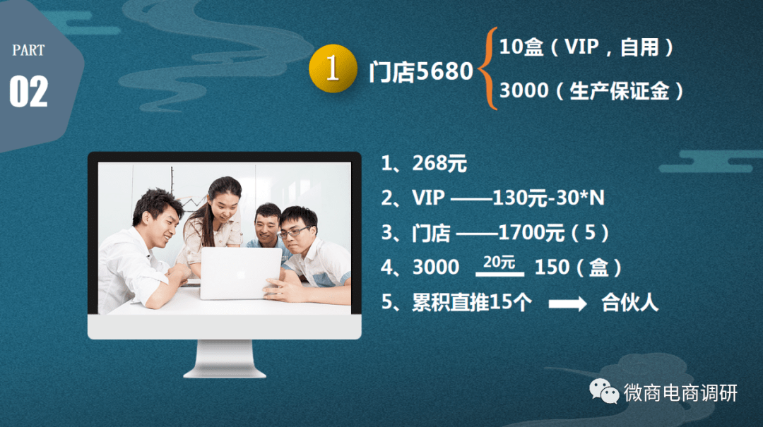 花5680元购买10盒百草药灸万痛冷敷凝胶,可直接成为门店级别代理,其中包含了3000元的保证金,成为门店级别的代理之后,复购价格为268元,每发展一名VIP 可以获得130元的利润,自己发展的VIP再去发展新的VIP,门店代理还可以拿到30元的奖励,该奖励可以拿无数次。门店级别代理直接推荐门店代理,可以获得1700元的直推奖,自己推荐的代理每购买一盒产品,该门店代理还可以拿到5元钱的返利。另外,代理每销售一盒产品,还会获得20元的保证金返还,直到销售150盒,保证金全部返还给门店代理。当门店代理累计直推15个新门店代理时,即可晋升为合伙人级别代理。