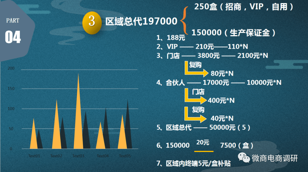 花197000元购买250盒百草药灸万痛冷敷凝胶,可直接成为区域总代级别代理,其中包含了150000元保证金。成为区域总代之后,复购价格为188元,每发展一名VIP 可以获得210元的利润,自己发展的VIP再去发展新的VIP,门店代理还可以拿到110元的奖励,该奖励可以拿无数次。区域代理直接推荐门店代理,可以获得3800元的直推奖,所推荐的门店代理再发展一名新的门店代理,此时还可以拿到2100元的间接推荐奖,这个奖励也可以拿无数次,团队代理复购,合伙人代理还可以拿到80元的返利。区域总代直接推荐合伙人可以拿17000元的直推奖,所推荐的合伙人代理再发展一名新的合伙人代理,此时还可以拿到10000元的间接推荐奖,间接发展门店代理,可以获得400元的极差奖励。发展的新合伙人代理每购买一盒产品,上级合伙人代理还可以拿到40元钱的返利。区域总代直接推荐一名新的区域总代,可以直接获得50000元的直推奖,复购产品每盒还能拿到5元钱的返利。另外,代理每销售一盒产品,还会获得20元的保证金返还,直到销售7500盒,150000元保证金全部返还给区域总代。区域总代还可以享受该区域内终端销售每盒产品5元每盒的补贴。