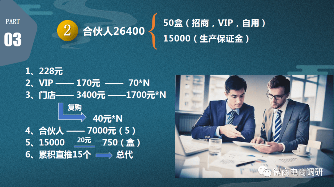 花26400元购买50盒百草药灸万痛冷敷凝胶,可直接成为合伙人级别代理,其中包含了15000元保证金,成为合伙人级别代理之后,复购价格为228元,每发展一名VIP 可以获得170元的利润,自己发展的VIP再去发展新的VIP,门店代理还可以拿到70元的奖励,该奖励可以拿无数次。合伙人级别代理直接推荐门店代理,可以获得3400元的直推奖,所推荐的门店代理再发展一名新的门店代理,此时还可以拿到1700元的间接推荐奖,这个奖励可以拿无数次,团队代理复购时,合伙人代理还可以拿到40元的返利。合伙人代理直接推荐合伙人可以拿7000元的直推奖,发展的新合伙人代理每购买一盒产品,上级合伙人代理还可以拿到5元钱的返利。另外,代理每销售一盒产品,还会获得20元的保证金返还,直到销售750盒,15000元保证金全部返还给合伙人代理。当门店代理累计直推15个新合伙人代理时,即可晋升为区域总代。