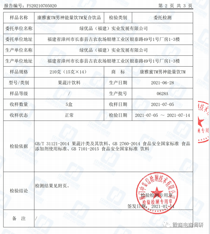 另外,彩仙膜巢还有一款男性功能产品,叫做康雅蜜男神能量饮,据代理介绍可以达到补肾壮阳、改善前列腺、尿频尿急的功效,但是一份针对该产品的检测报告显示,康雅蜜男神能量饮只是一种果蔬汁饮料,是一种食品,而一款果蔬汁饮料就能补肾壮阳?这明显涉嫌虚假宣传。