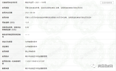 据悉,该处罚通知书文号为南武市监罚﹝2021﹞199号,处罚日期为2021年8月4日。依据《禁止传销条例》规定,宁市武鸣区市场监督管理局对当事人广西康佳龙现代农业科技有限责任公司罚款12.0万元并没收违法所得0.08万元。