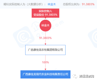 企查查显示,广西康佳龙现代农业科技有限责任公司成立于2011年10月10日,注册资金2000万元,实缴资本300万元。公司法人代表为林金木,也是公司最终受益人,通过直接或间接持股91.3803%。
