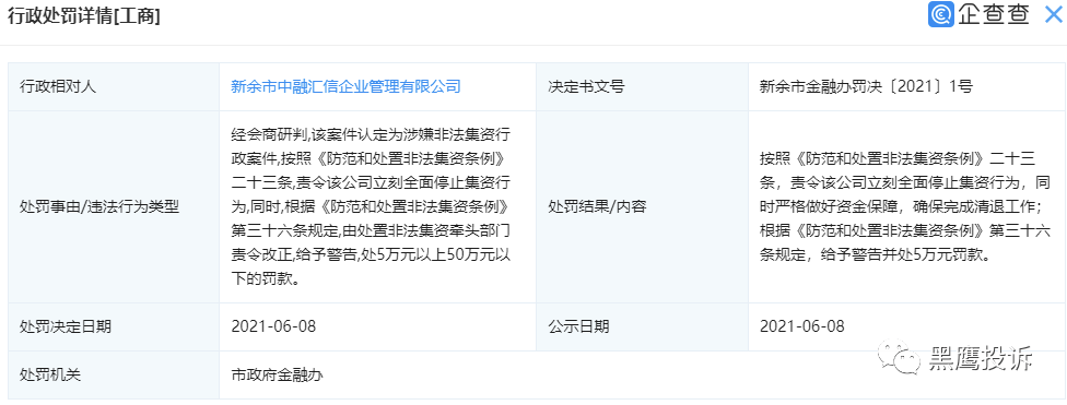 日前,黑鹰投诉在企查查上发现一条行政处罚通知,显示新余市中融汇信企业管理有限公司因非法集资被新余市政府金融办予以5万元罚款。
