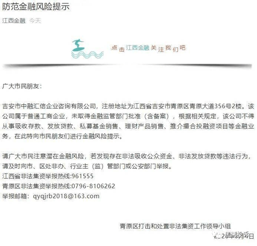 而在此前,该公司法人代表宋贵军名下的关联企业,吉安市中融汇信企业咨询有限公司在2020年9月8日,就因非法集资被江西省吉安市青原区打击和处置非法集资工作领导小组予以打击,并发布了防范金融风险提示,指出吉安市中融汇信企业咨询有限公司,注册地址为江西省吉安市青原区青原大道356号2楼。该公司属于普通工商企业,未取得金融监管部门批准(含备案),根据相关规定,该公司不得从事吸收存款、发放贷款、私募基金销售、理财产品销售、推介撮合投融资项目等金融业务。