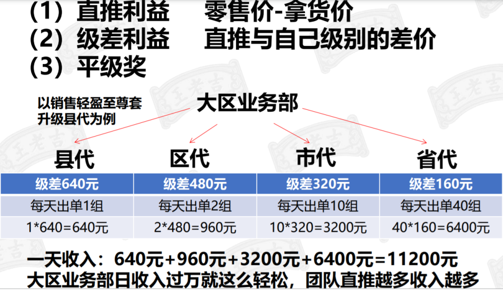 “级差利益简单讲,就是经销商间接赚取自己下级经销商销售利润的差价,以大区业务部销售一个1896元王老吉轻盈至尊套装为例,大区业务部以下还有省代、市代、区代、县代,每个级别差价为160元,省代每推出一个该套装,大区业务部赚160元,市代每推一个套装,大区业务部是赚320元,区代推出这样一个套装,大区业务部赚480元,以此类推,赚每个级别间的差价。而平级奖是经销商发展一个同一级别的经销商所赚取的利润。”该经销商称。