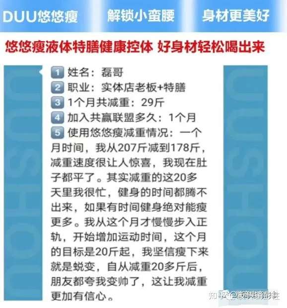 而在经销商于线上开展的宣传攻势下,一些所谓的“减肥成功案例”也相继跳进了大众的目光所及之处,并引来了无数参与者为之“代言”。