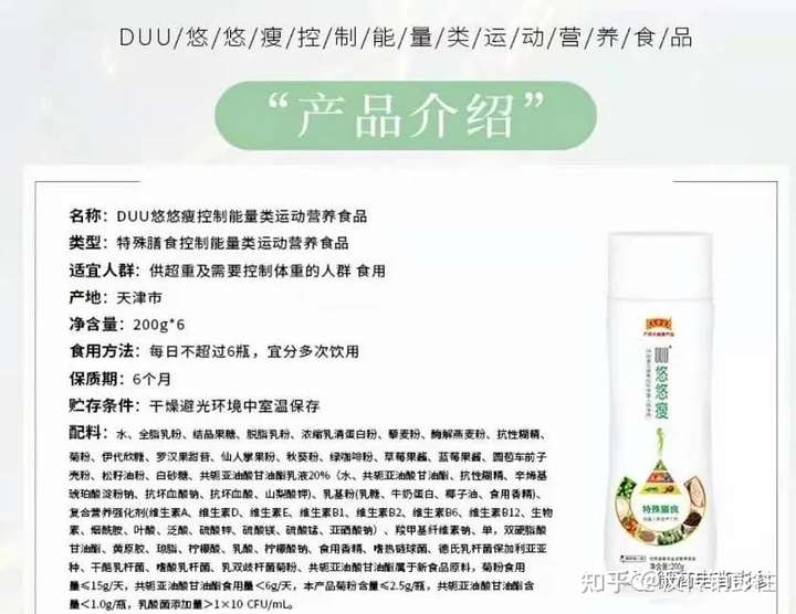 关于产品,类型为“特殊膳食控制能量类运动营养食品”的“DUU悠悠瘦控制能量类运动营养食品”为悠悠瘦项目运营方所推向市场的核心产品。