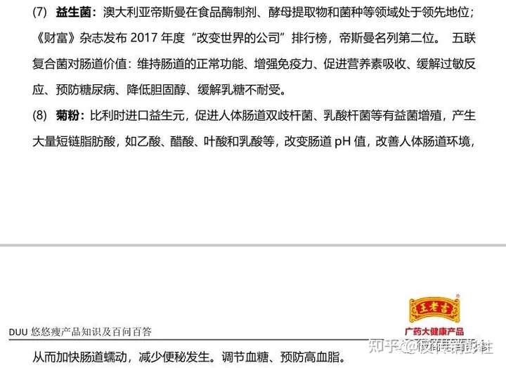 此外,《悠悠瘦百问百答》等资料还存在通过宣传该产品成分的功效,进而暗示产品本身具有其他功效的行为。比如益生菌成分,就被介绍为具有增强免疫力,预防糖尿病,降低胆固醇等功能;再比如菊粉,就被介绍为具有减少便秘发生,调节血糖、预防高血脂的效用。
