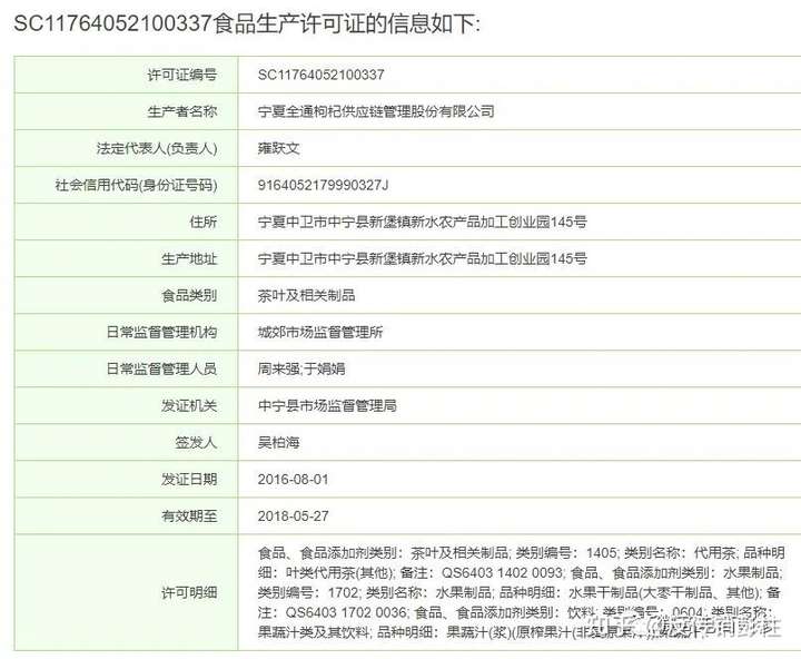 据“三里人家食品专营店”提供的资料显示,该产品的许可证号为SC11764052100337,生产厂家为宁夏全通枸杞供应链管理股份有限公司。