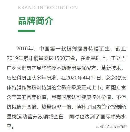 关于悠悠瘦的品牌背景,据悠悠瘦网站介绍,2016年,中国第一款粉剂瘦身特膳诞生,截止2019年累计销量突破1500万盒。在此基础上,王老吉广药大健康产品悠悠瘦不断推出最优配方,革新技术,历经科研团队多年研发,在2020年4月11日,悠悠瘦液体特膳作为粉剂特膳的全新升级版正式上市。新配方富含丰富的营养价值,具有国家认可健康控体价值,不但抗饿值升四倍,热量也降一倍,填补了国内首个控制能量类运动营养液领域空白,同时也达到了国际领先水平。