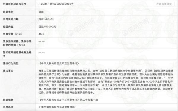 近日,养乐多关联公司上海益力多乳品有限公司新增一则行政处罚,处罚事由为宣传“益生菌在新冠病毒防治中有重要作用”等,极易使消费者误解。被上海市浦东新区市场监督管理局处以45万元罚款。