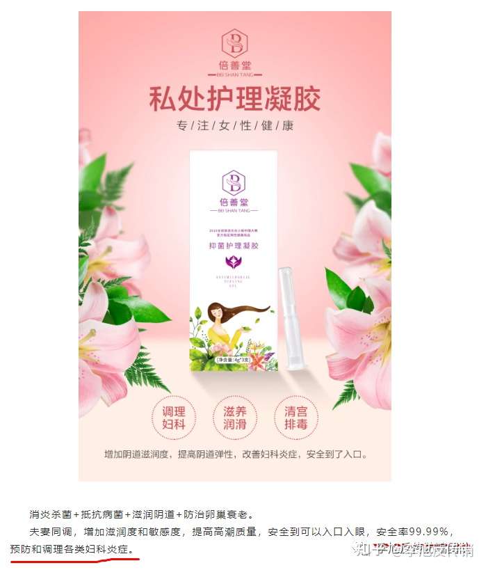 公众号“倍善堂”在宣传中提到,爱尔珍露凝胶是既能避孕又能调理妇科炎症的水溶性凝胶。其避孕率高达99.99%。不仅如此,在市场推广人员的口中,这款凝胶更是有着“神奇”的功效。