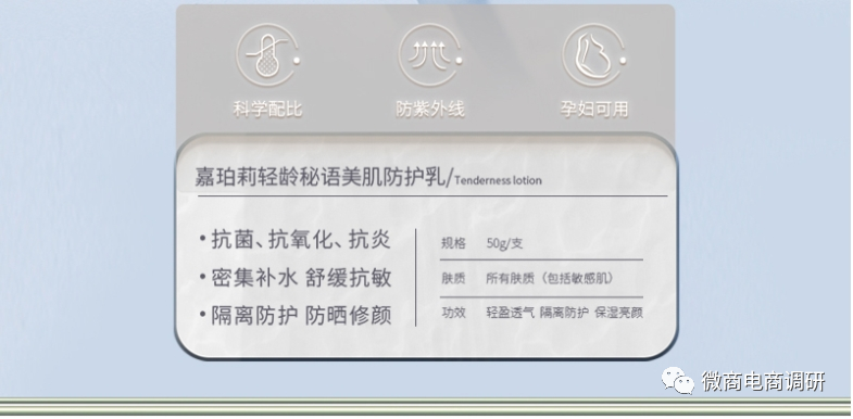 嘉珀莉“轻龄秘语”系列的另一产品嘉珀莉轻龄秘语美肌防护乳在微信小程序“嘉珀莉商城”中被描述到:该产品能够防晒防紫外线,并且还能够抗菌抗炎。