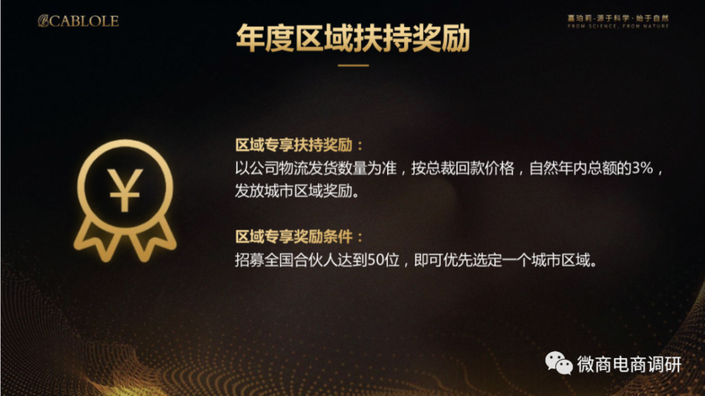 年度区域扶持奖励(区域专享):一年度招募满50位合伙人,可以优选选择一个城市作为专属区域,该区域公司每年发往该地的全部嘉珀莉产品利润的3%。并且所招募全国合伙人每增加50个,所享受区域扶持奖励就会增加一个区域,上不封顶。