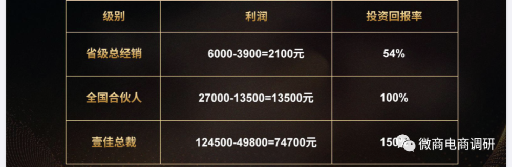 从其模拟利润算法表中我们看到:省级总经销投资回报率为54%;全国合伙人的投资回报率为100%;壹佳总裁的投资回报率为150%。用经销商的话来说,利润和投资回报率,其实就是零售赚取差价所获得的利润。