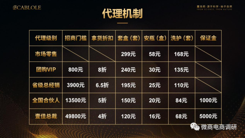 市场零售:0门槛加入,实则上并不能算到代理体系之中;团购VIP:一次性拿货800元,后续享受8折复购价;省级总经销:一次性拿货3900元,后续享受6.5折复购价格;全国合伙人:一次性拿货13500元,后续享受5折复购价;壹佳总裁:一次性拿货49800元,后续享受4折复购价。