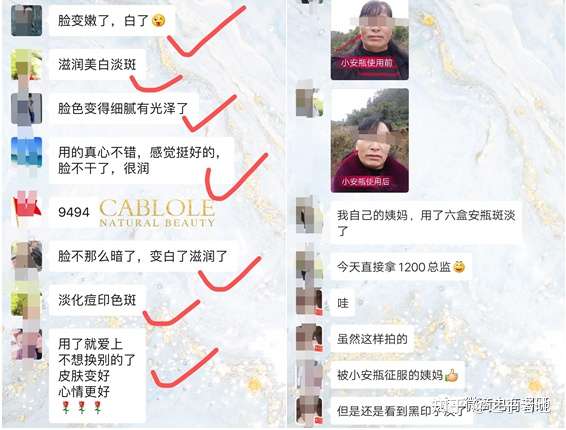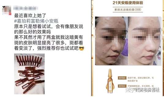 眼下,为了推广嘉珀莉的产品,许多经销商甚至晒出了一些顾客使用案例来证明产品的有效性,有的经销商称使用了该产品将自己痘印消除了,淡化了色斑;还有推广人员称该产品将自己暗黄有斑的皮肤提亮了不少,还有经销商晒出了顾客使用前后对比图来宣传该产品,“美白淡斑”的字样也在聊天记录中有迹可循。