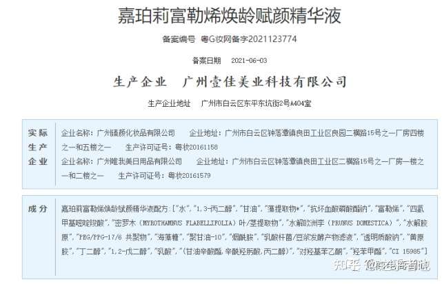 而实际上,该款产品的备案编号是粤G妆网备字2021123774,为国产非特殊用途化妆品,由广州壹佳生物科技有限公司委托广州臻颜化妆品有限公司和广州唯我美日用品有限公司所生产。