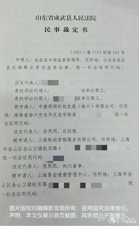 近日,刘李冰反传销团队获悉,据相关知情人透露,山东省菏泽市成武县市场监督管理局为防止被申请人转移或者隐匿违法资金,向成武县人民法院申请冻结中康明视科技发展(海口)有限公司、上海秋旭营销服务有限公司、上海易金健康管理中心、易彪(上海)企业管理中心、上海易土健康管理中心、上海汉恩健康管理中心、薪易捷(保康)信息技术有限公司、孙某明、郎某坤、张某凯、蔡某芸名下银行存款 9800 万元。