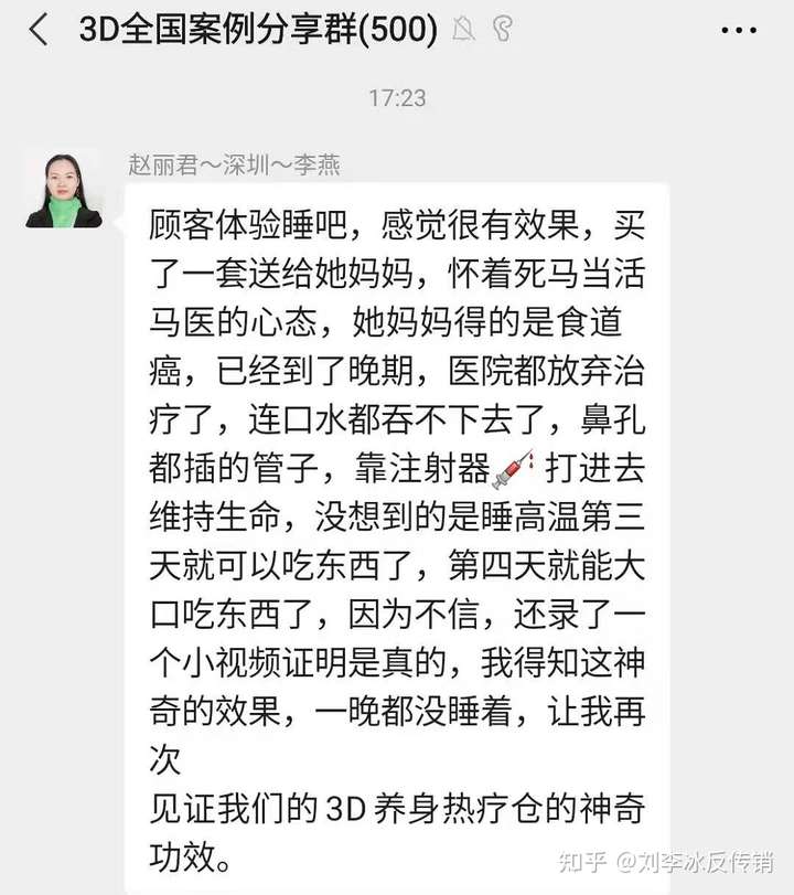 炎帝生物受害者提供了一个500人群案例分享的截图,妈妈得了食道癌,并且已经是晚期,医院都放弃治疗了。口水都吞不下去了,没想到睡高温《碧玺床垫》三天就可以吃东西了,第四天可以大口吃东西了。而且这样的案例还有很多。就感觉它 能治疗百病是的,无所不能。但是我自己体验以后没有任何变化。