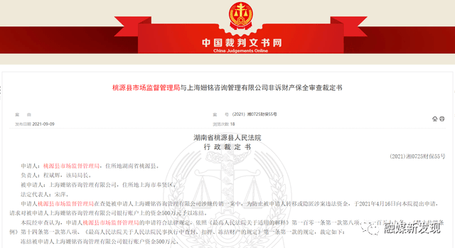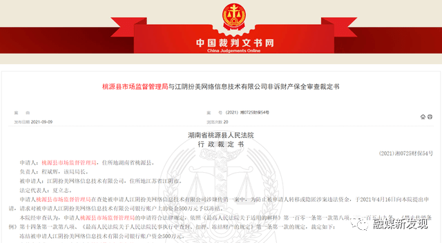 日前,中国裁判文书网上发布了两则财产保全裁定书(简称裁定书),题为《桃源县市场监督管理局与江阴扮美网络信息技术有限公司非诉财产保全审查裁定书》(案号(2021)湘0725财保54号),与《桃源县市场监督管理局与上海姗铭咨询管理有限公司非诉财产保全审查裁定书》(案号(2021)湘0725财保55号)。