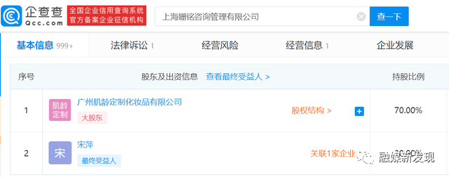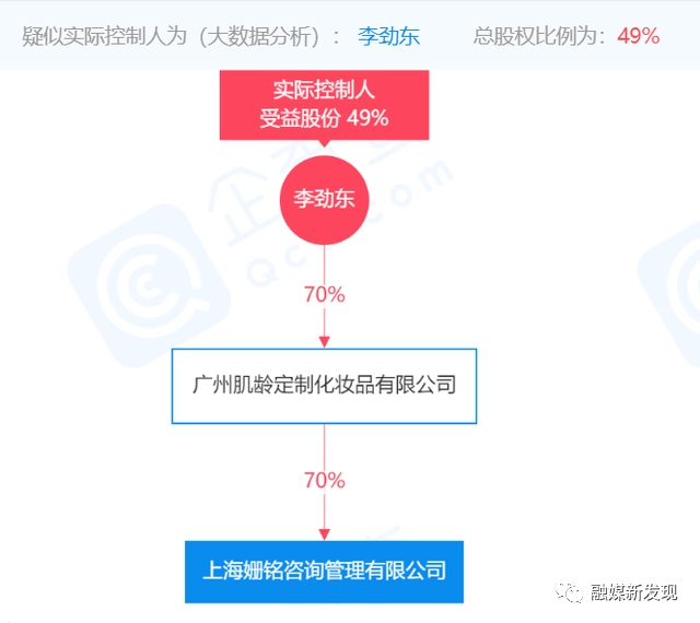 此外,夏立志与李劲东名下还有一家共同的关联公司—广州肌龄定制化妆品有限公司。夏立志为该公司的的监事,而李劲东为该公司的大股东和实际控制人,持股比例为70%。此外该公司刚好为上海姗铭咨询管理有限公司的大股东,持股比例为70%。