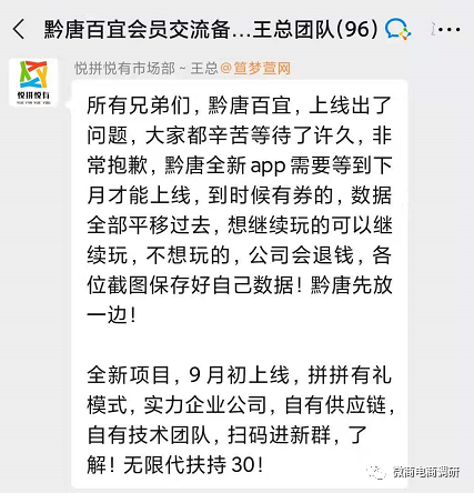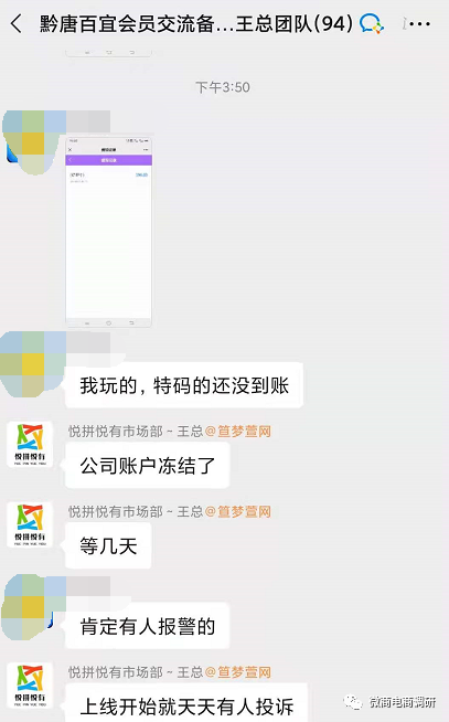 根据有关群聊截图来看,黔唐百宜的前景,目前已不甚乐观。有推广人员表示:“公司账户被冻结了。上线开始就天天有人投诉”。