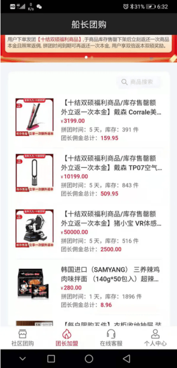胡先生说,这款软件赚钱的模式是“当团长,赚佣金”。点开软件中“团长加盟”模块,就能看到供拼团的商品。商品种类包括火鸡面、小型家电、桌椅板凳等等,价格在几百到千元不等,越贵的商品可获得的佣金就越多,从几块到几十块不等。充值并购买商品后即成为“团长”,发起拼团后,平台会自动安排成团。