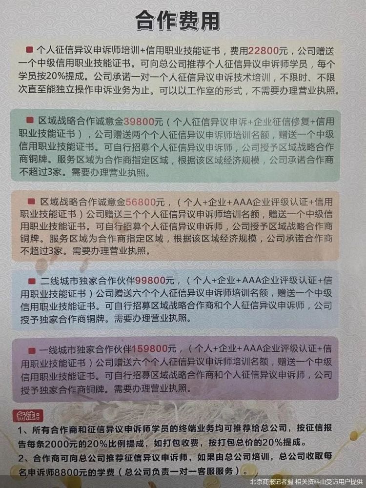 北京商报记者根据李彦提供的信息梳理发现,致兴征信当前共有四大业务板块,包括个人征信异议申诉、企业征信修复、AAA企业评级评价、信用职业技能证书的中高级培训和发证。区域级以上代理可从事全部服务内容。