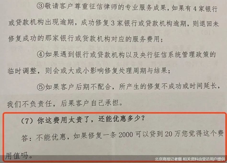 在李彦提供的培训材料中,北京商报记者注意到,对于与用户沟通中常见问题,“你这费用太贵了,还能优惠多少?”,回复话术则为“不能优惠,如果修复一条2000可以贷到20万,您觉得这个价格值吗。”