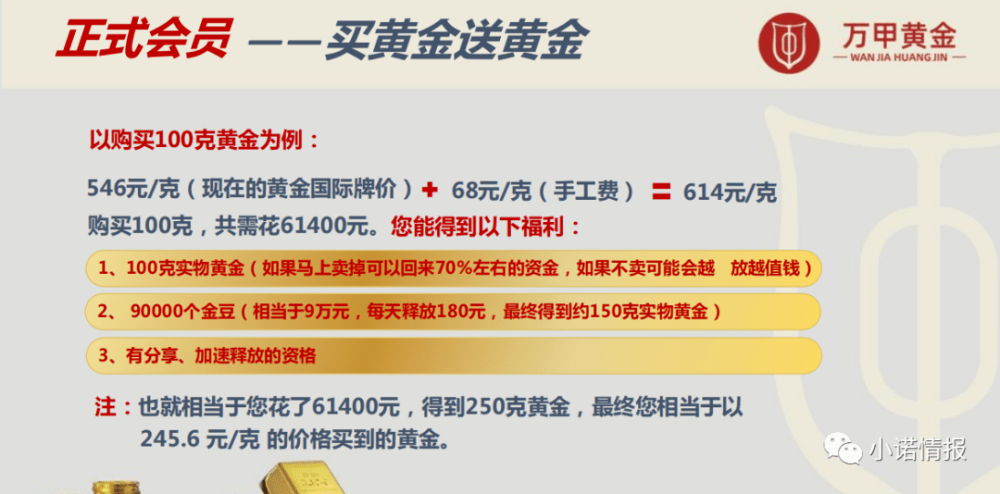 小诺接到投诉第一时间翻看相关项目介绍,以及找宣传人员了解该项目模式。发现这个项目包装还是用了点心思的。简单来说就是让参与者买实体黄金,然后利用模式化返利。