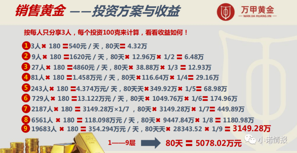 今天说这样一个项目,PPT宣传按照模式运作可以让参与者80天内赚5000万!看到这样的消息,小诺觉得好久没遇到如此牛逼宣传的项目了,时隔好久终于遇到一个。这个项目的名字叫“万甲黄金”。