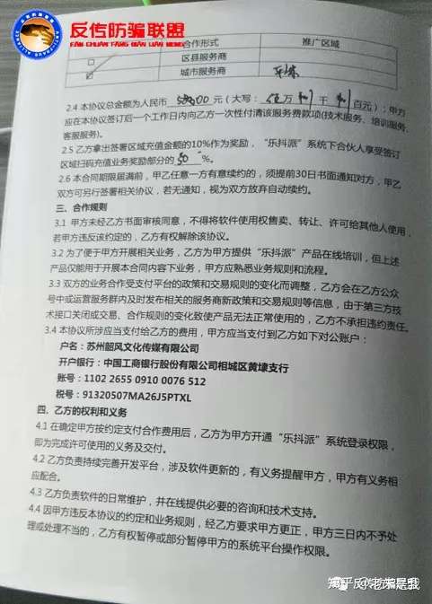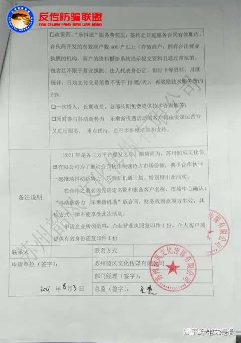 虚构抖音合作项目、涉嫌合同欺诈,反传防骗联盟希望苏州韶风公司能够及时、快速、妥善处理投诉事宜,反传防骗联盟相信,合同并非苏州韶风公司的保护伞,更不是公司态度强硬的理由,毕竟法律维护的是合法人的权益,并不是骗子的避风港!